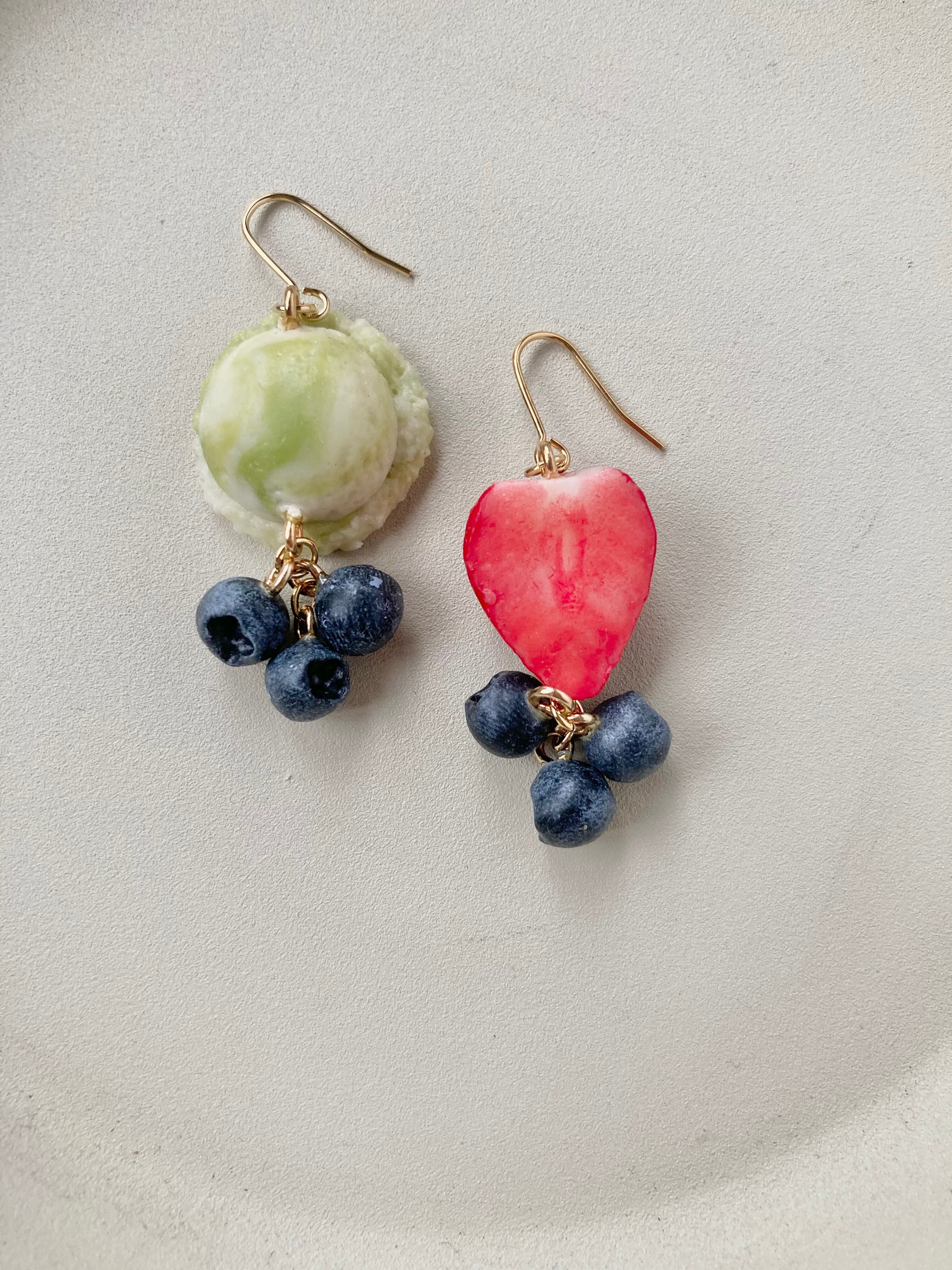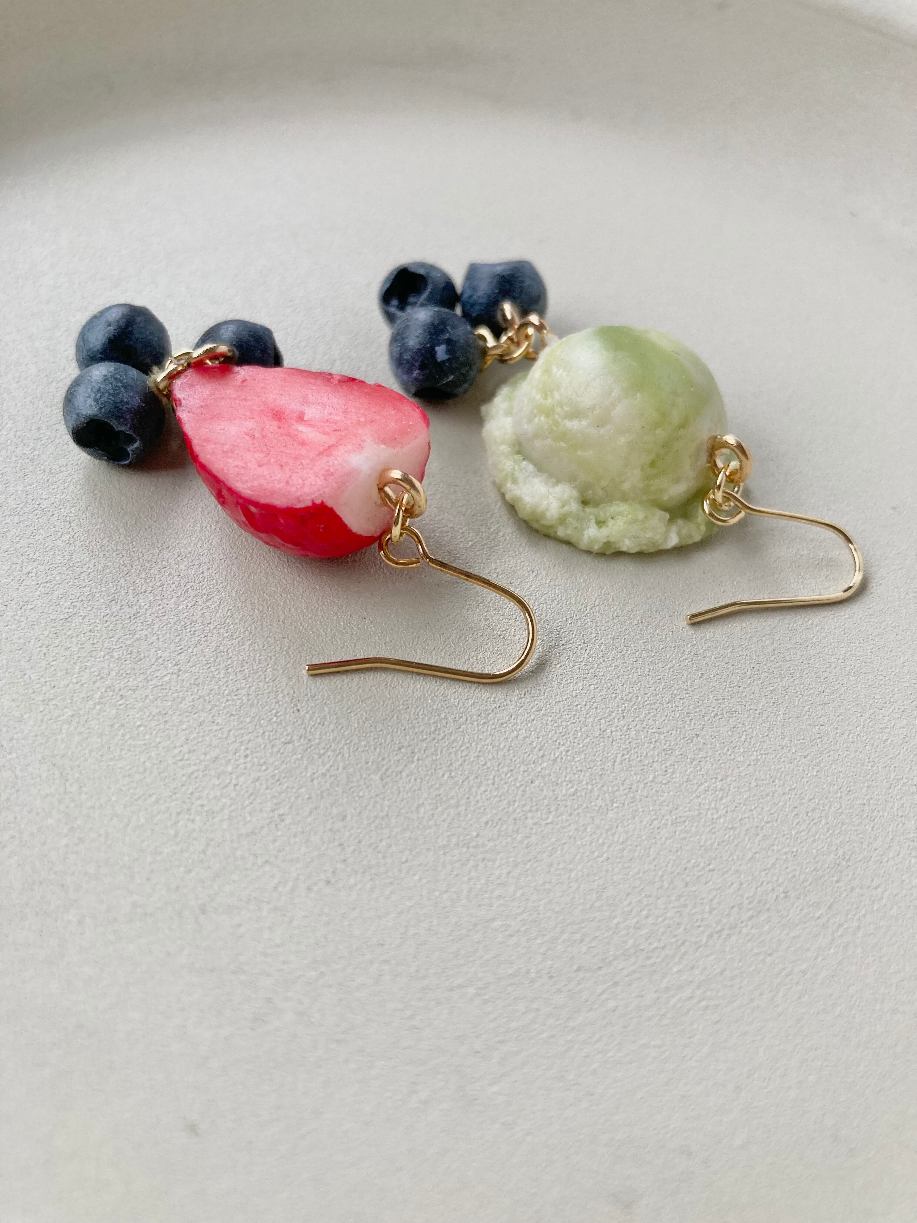 抹茶のアイスクリームとイチゴ、ブルーベリーのピアスです