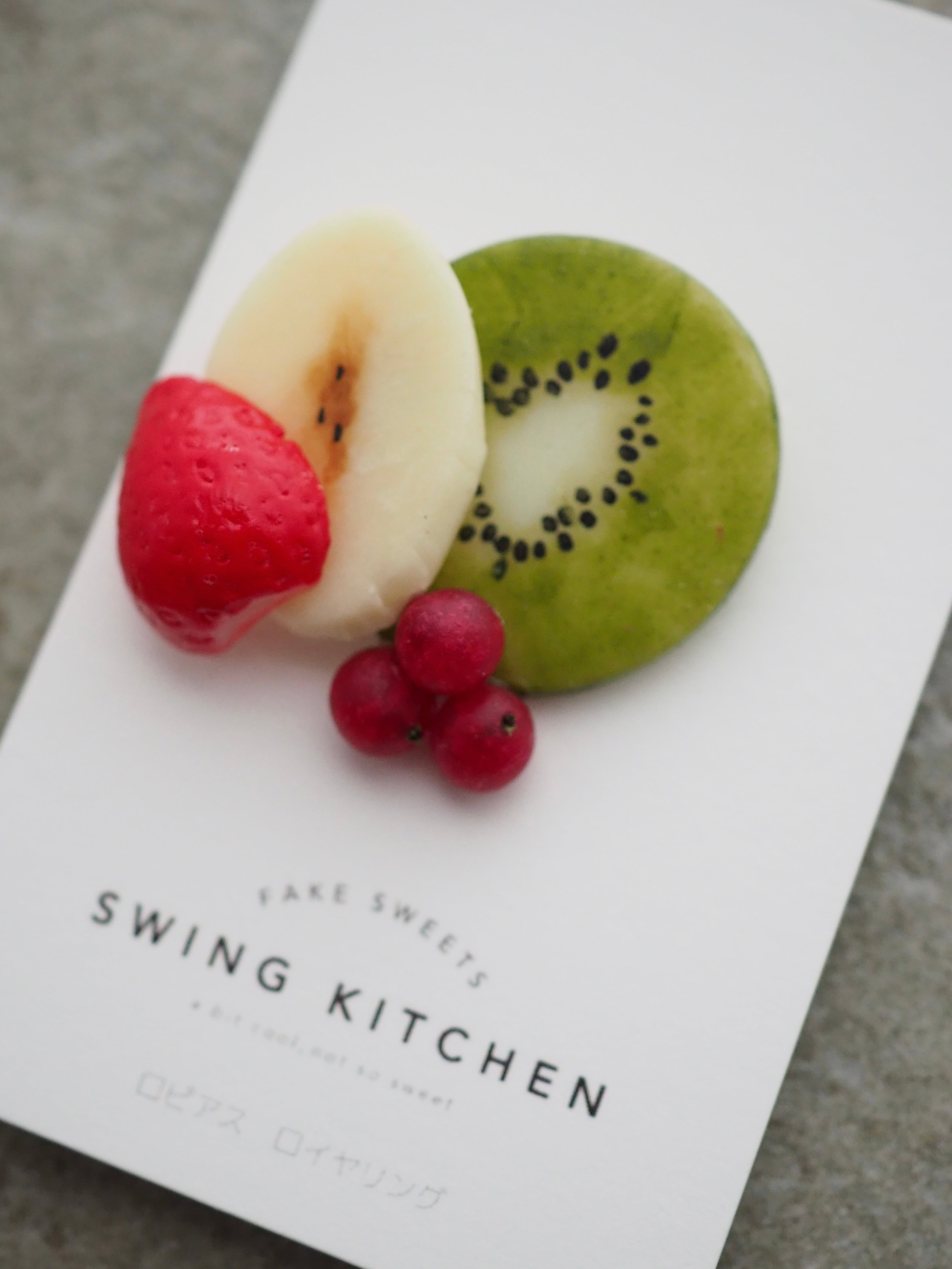 キウイ、バナナ、イチゴ、赤すぐりを組み合わせたデザインの